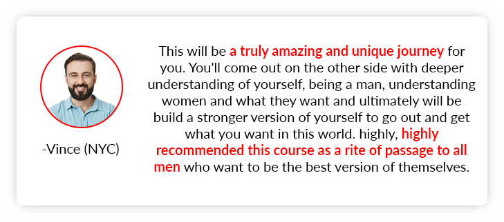 a truly amazing and unique journey for you. You'll come out on the other side with deeper understanding of yourself, being a man, understanding women and what they want and ultimately will be build a stronger version of yourself to go out and get what you want in this world. Highly,